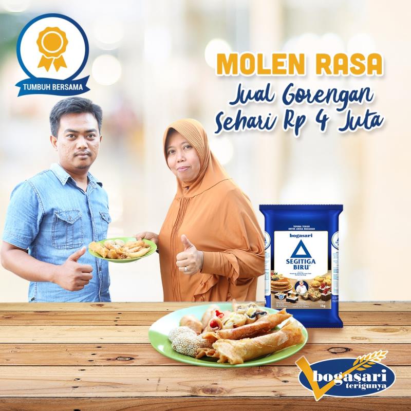 Awalnya dagangan mereka hanya menghabiskan 3 kg terigu Segitiga Biru untuk membuat gorengan pisang molen, tahu dan tempe. Mereka pun menekuni dengan sungguh dan semakin berkembang. Konsumsi terigu Segitiiga Biru menjadi 25 kg atau 1 sak sehari untuk membuat 600 kulit molen dan 15 kg terigu Cakra Kembar untuk membuat kulit pisang caramel.